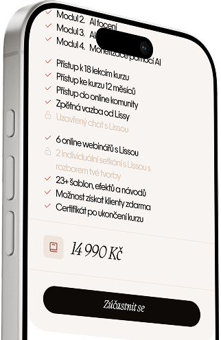 AI Hobby tě naučí všechno, co potřebuješ k tvorbě AI obsahu — fotek, videí i avatarů. Je ideální, pokud tě AI tvorba zajímá, ale neplánuješ ji využívat k podnikání nebo se tím živit. AI Pro je pro ty, kdo chtějí AI tvorbu reálně využít ve svém byznysu — ať už pro vlastní firmu, marketing nebo klienty. AI Master je nejlepší volba pro ty, kdo to myslí naprosto vážně — kromě všeho z AI Pro dostaneš osobní mentoring od Lissy, která s tebou individuálně rozebírá tvou tvorbu, posouvá tě a po absolvování ti začne předávat vlastní klienty. Je to garantovaná cesta, jak se AI tvorbou začít živit.